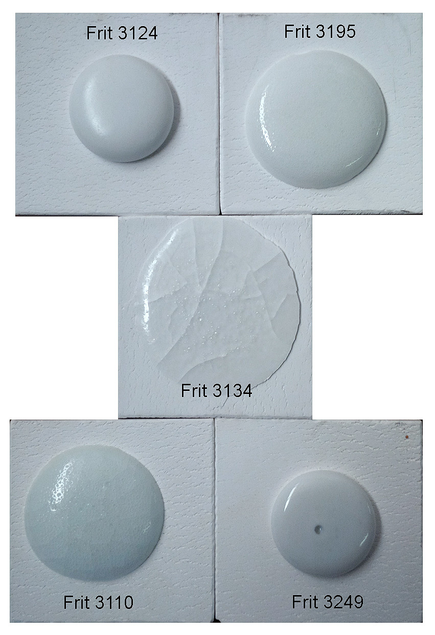 Five common North American Ferro Frits fired at 1850F on alumina tiles (each started as a 10-gram GBMF test ball and flattened during the firing). At this temperature, the differences are more evident than at 1950F. The degree of melting corresponds mainly, but not only, to the percentage of B2O3 present. Frit 3134 is the runaway leader because it couples that with almost no Al2O3 to stabilize the melt. Notice also the crack pattern, it is also very high in Na2O and thus has a high COE. However, why does Frit 3110 melt so well even though it contains almost no B2O3? Even higher Na2O, it is a powerful flux. Its COE is even higher than Frit 3134, but it is thick enough to have resisted cracking far (but it will in time).