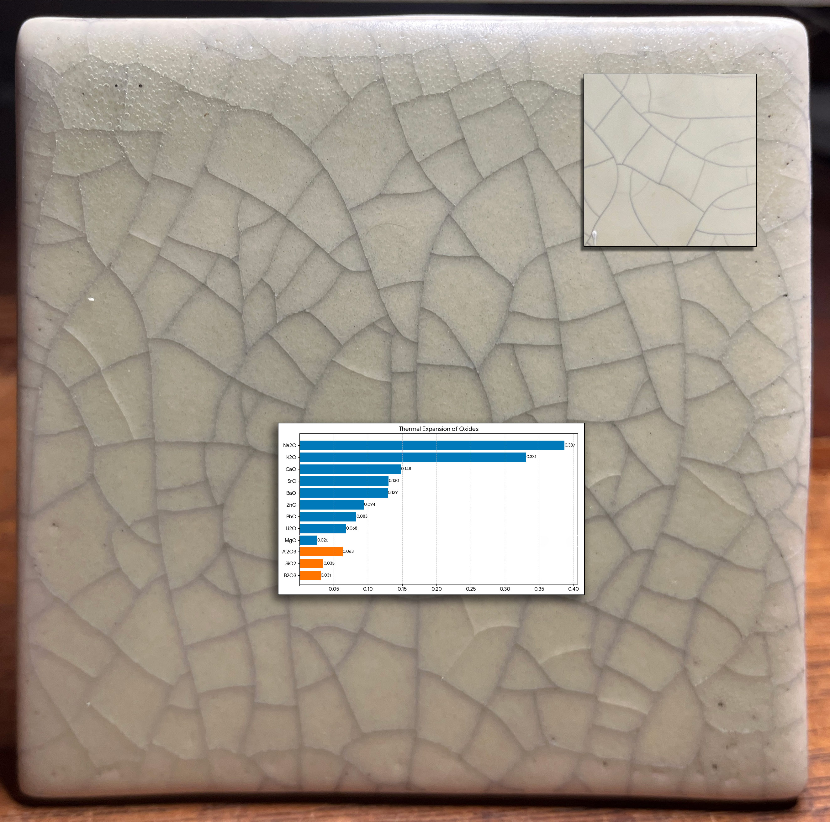 The reason why functional mattes seldom craze can be seen in the chemistry. This chart compares the thermal expansions of the oxides that combine to form the fired glaze matrix. ~80%+ of the makeup of almost all common base glazes (without colorants, opacifiers) is SiO2 and Al2O3 (orange bars). Mattes almost always need a low Si:Al ratio (e.g. below 6:1). The rest is fluxing oxides to melt them (the blue bars + B2O3). Here is the problem with making a crazing matte: Almost all crazing is caused by high levels of K2O and/or Na2O (the top two bars on the graph). But they produce high gloss (as can be seen in this test tile). The main matting fluxes and agents are MgO, CaO, SrO, BaO; they have a low COE (and don't craze glazes). Further, both zircon and tin oxide, the opacifiers needed, also have low thermal expansions!