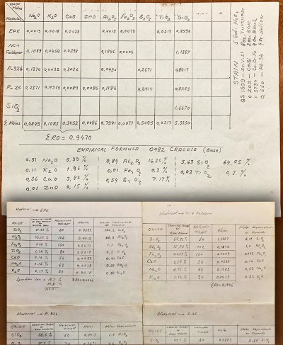 Notice that he took the manufacturer-supplied percentage analysis for each material (bottom) and calculated the unity formula for use in his batch to formula calculation (top). The recipe material weight amounts are missing in the latter; this appears to be his effort to create a documentation page of the recipe on the oxide formula level (this is what mattered to him). It was a time when frit formulas were published by their manufacturers. He also calculated the glaze's chemistry as a percentage analysis, likely to lay a basis to assess it against stated requirements from stain suppliers (certain stains only work when the host glaze chemistry meets a certain profile).