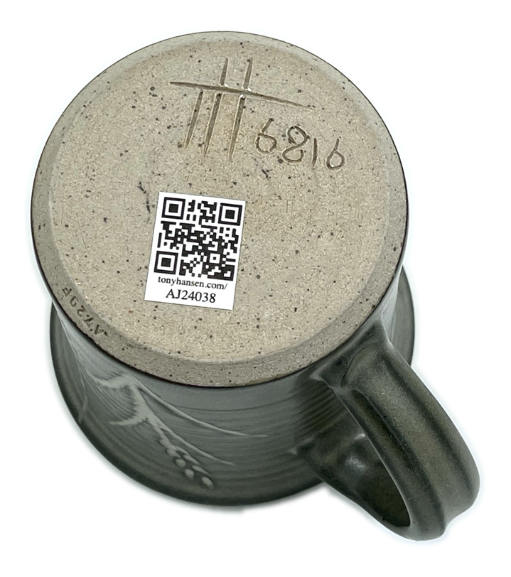 These mugs are intended to demonstrate the techniques, recipes and materials I promote on this site. My audience is potters, hobbyists and manufacturers. Each mug described maintains its own permanent page here with detailed physical description as well as information on every detail of how it was made. Since each has links into many areas of this site that provide more detail, researching just one mug could take hours! The "AJxxxx" serial number on any can be searched here.