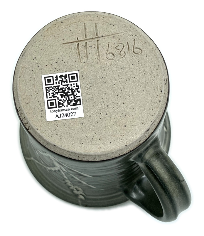 These mugs are intended to demonstrate the techniques, recipes and materials I promote on this site. My audience is potters, hobbyists and manufacturers. Each mug described maintains its own permanent page here with detailed physical description as well as information on every detail of how it was made. Since each has links into many areas of this site that provide more detail, researching just one mug could take hours! The "AJxxxx" serial number on any can be searched here.
