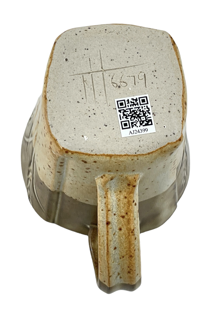 Technique: Hand-rolled and assembled, engobed inside and top outside, incised, dip-glazed